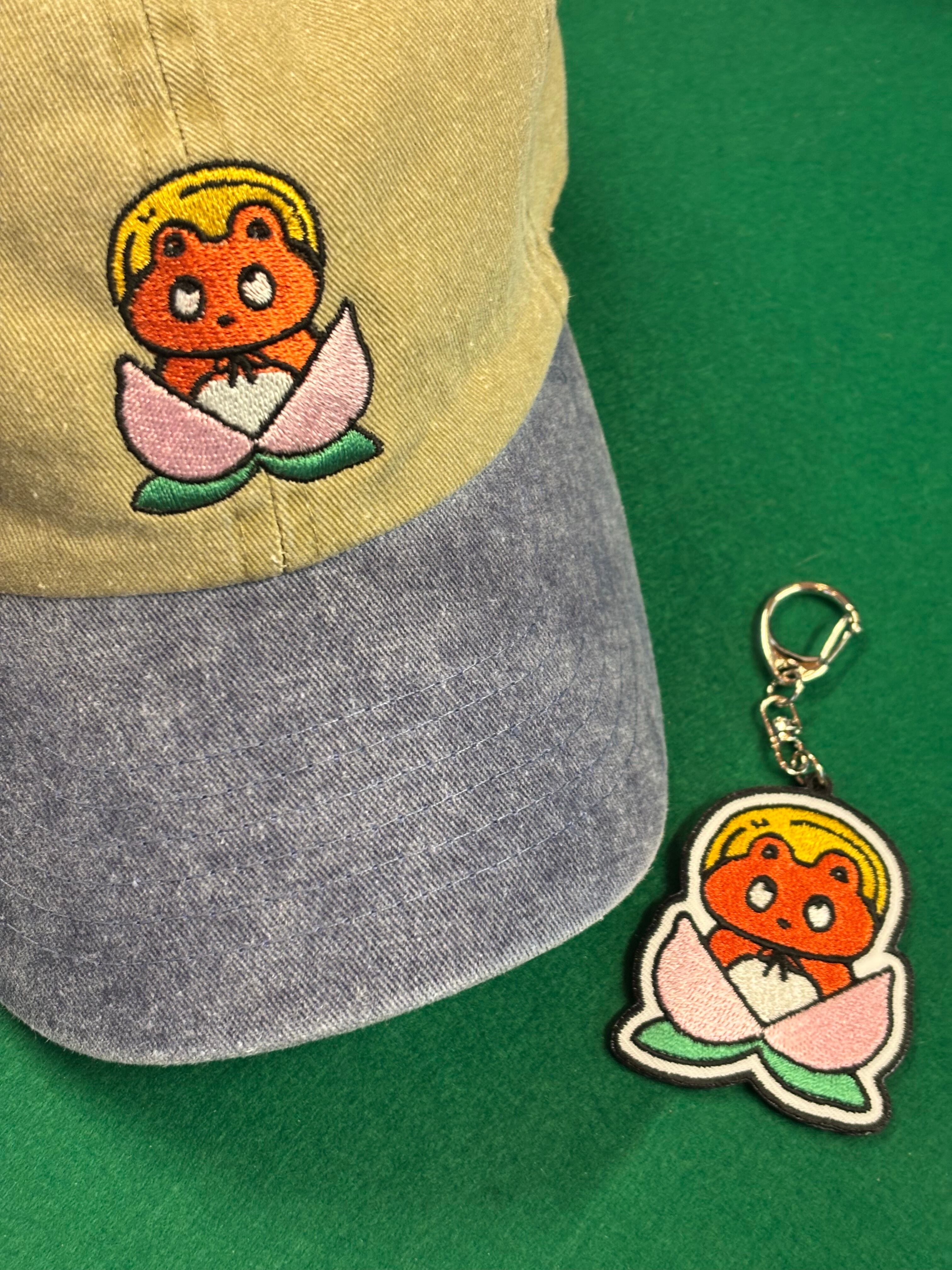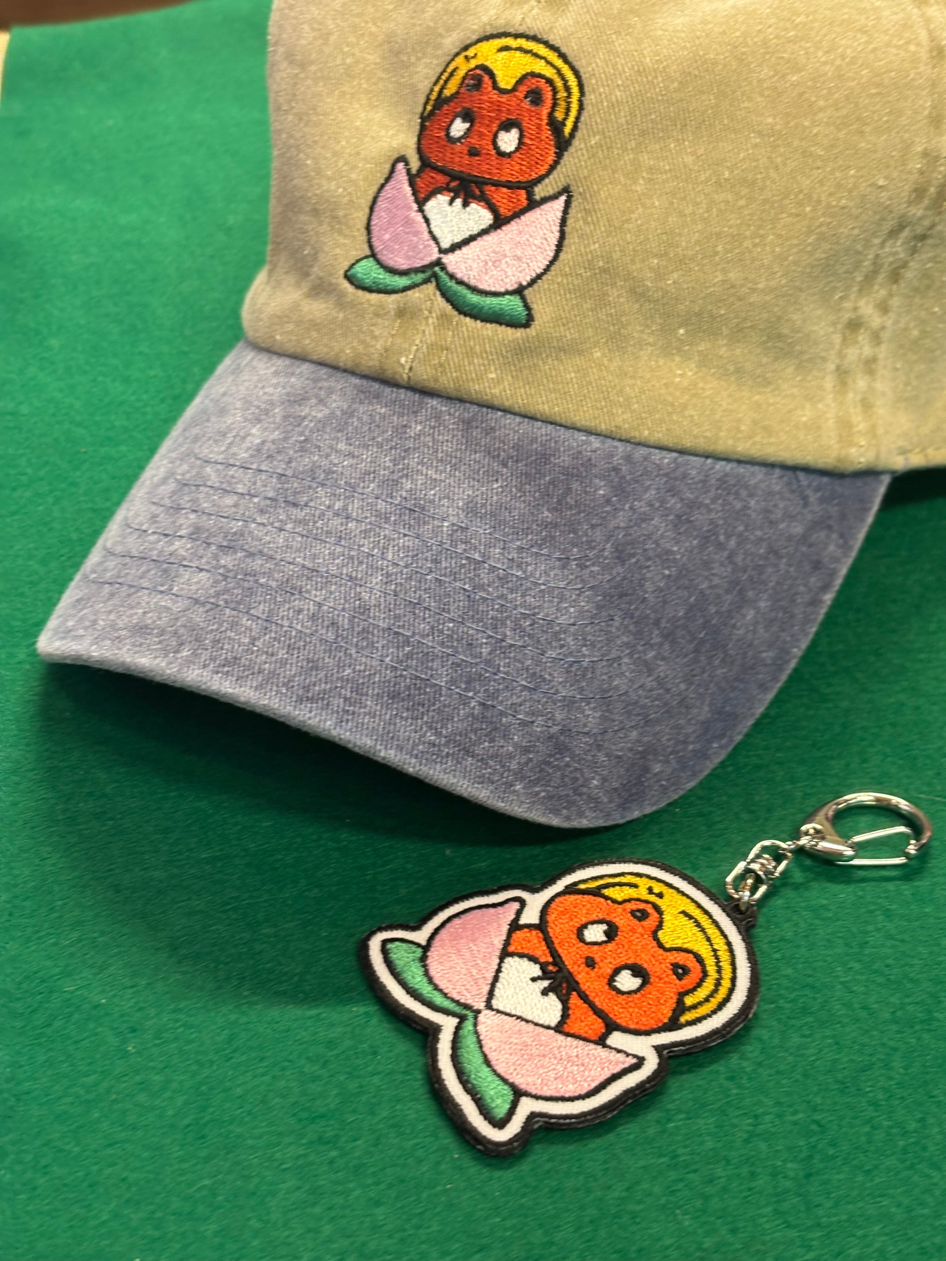 ヒダカナオトが描くぼんやり子だぬきが「桃から産まれたぼんやり子だぬき」になって刺繍のキーホルダーになりました。