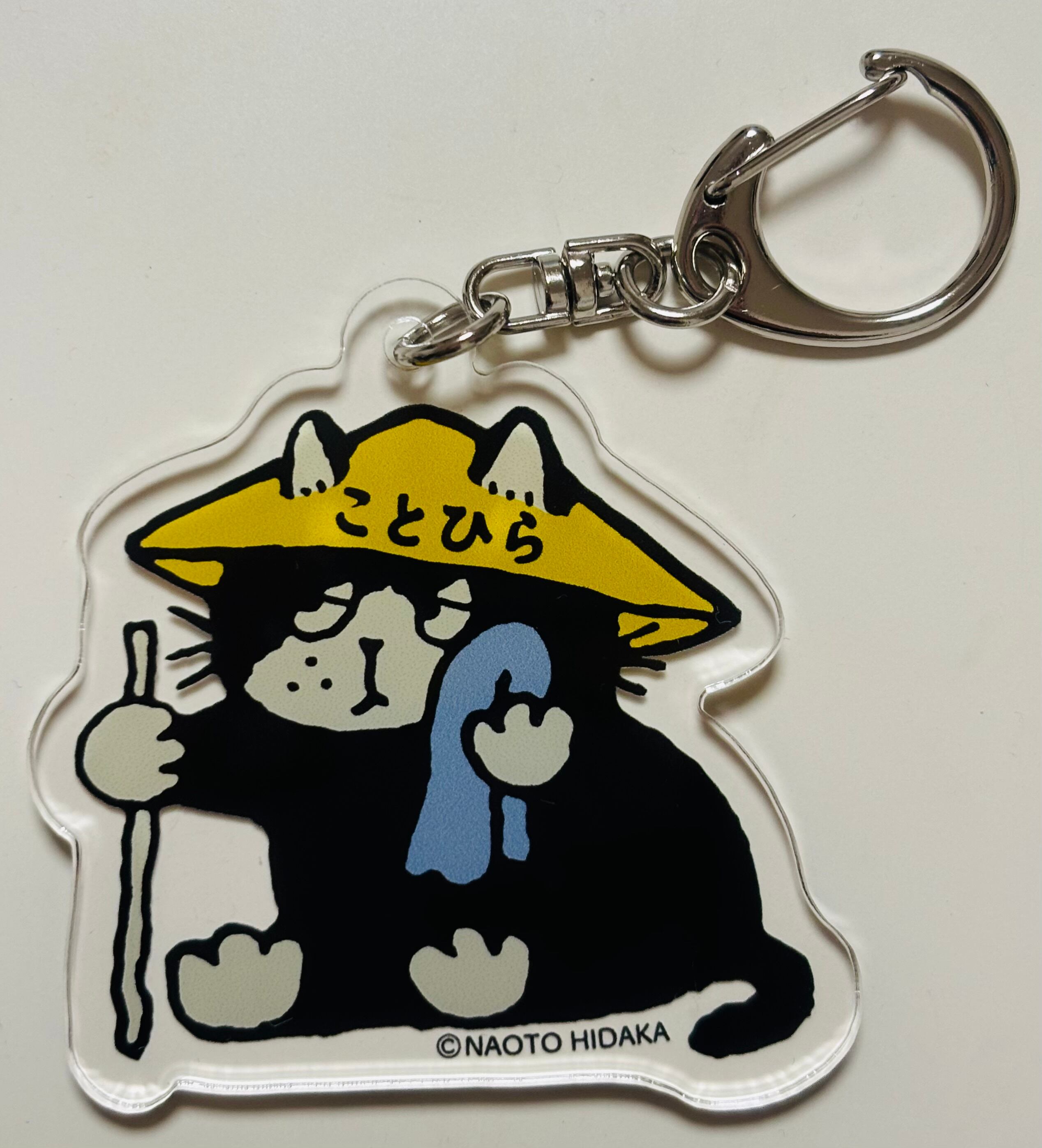 菅笠をかぶって参拝する、ちょっと疲れた少し目付きの悪いネコのアクリルキーホルダーです。
