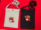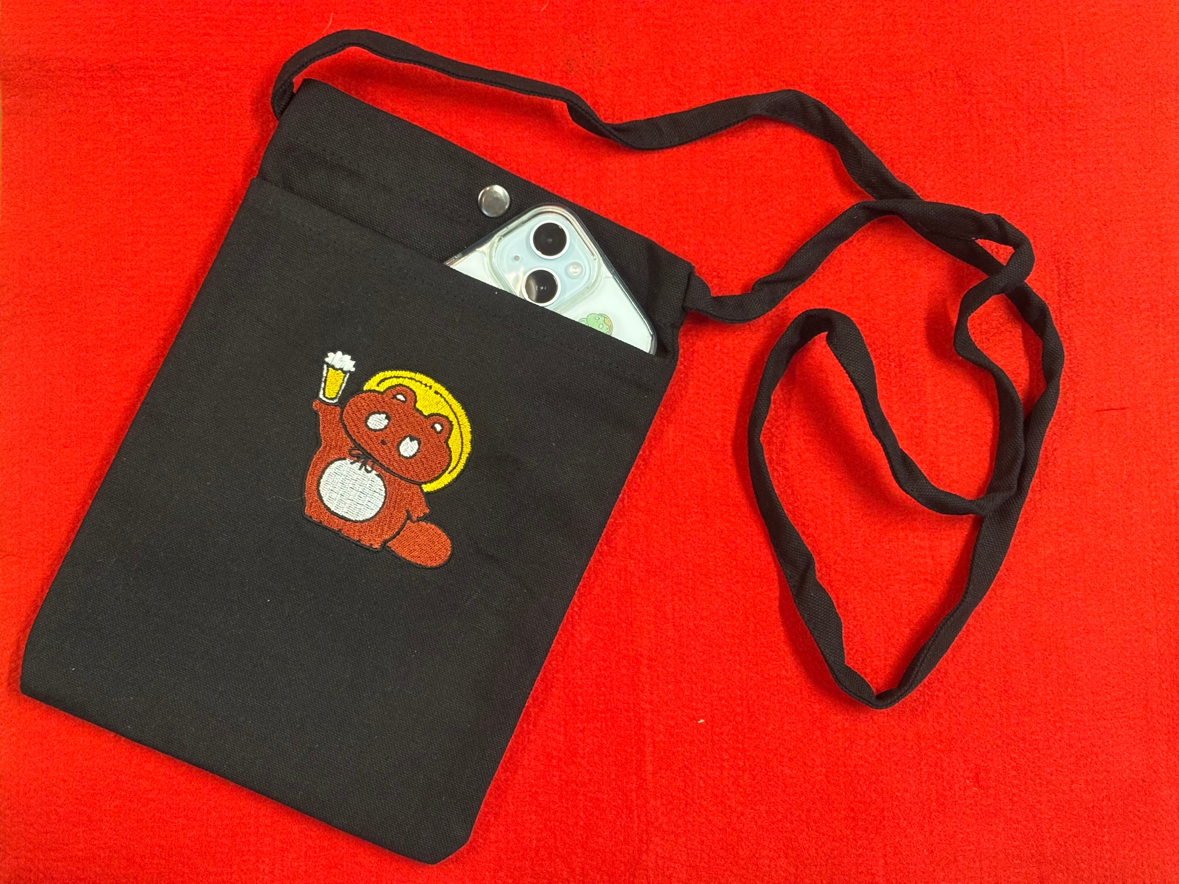 「ぼんやり子だぬき」が乾杯している姿のイラストを刺繍で表した可愛いサコッシュです。携帯電話とお財布が余裕で入り、ちょっとしたお出かけなどに合っています。