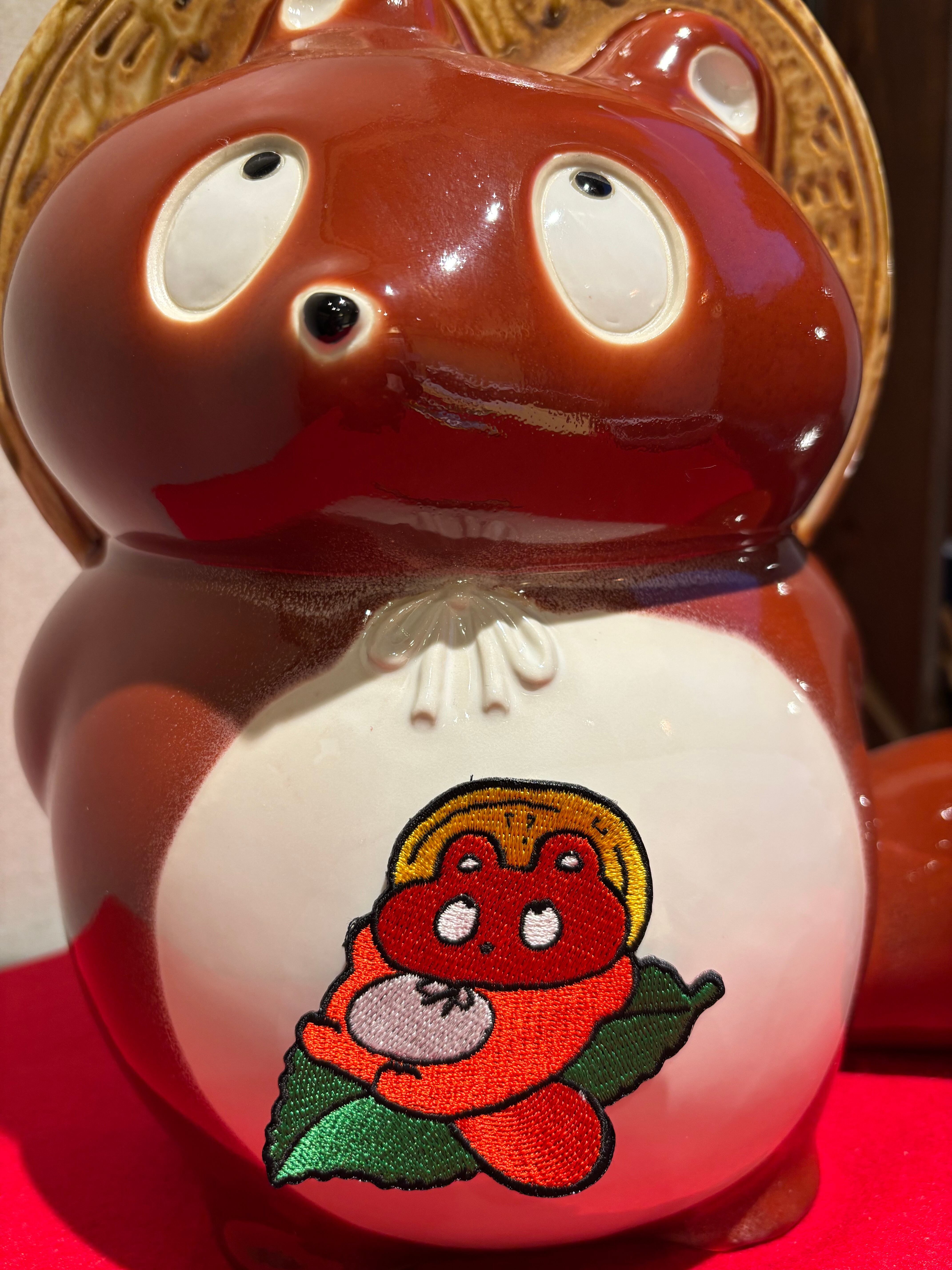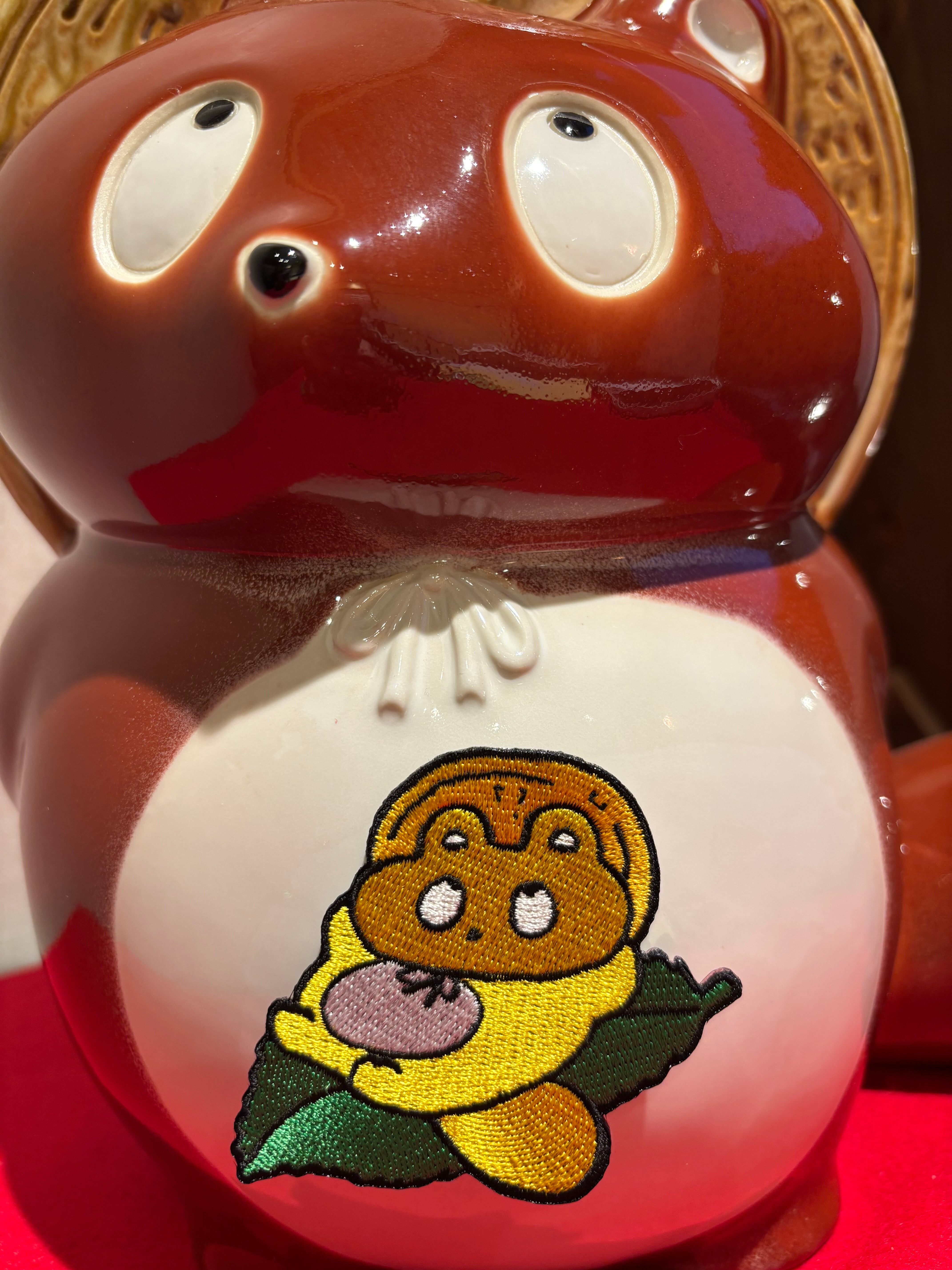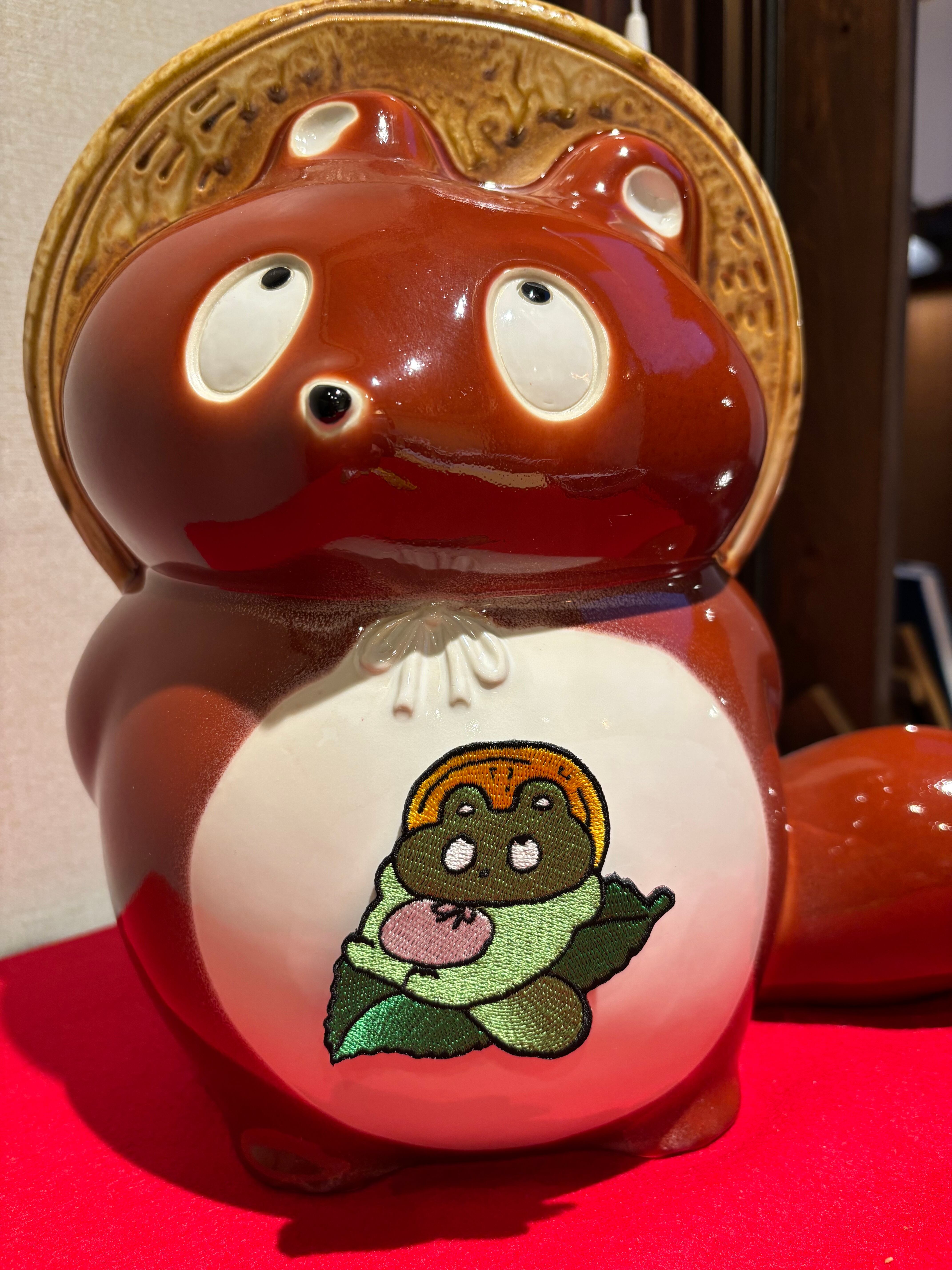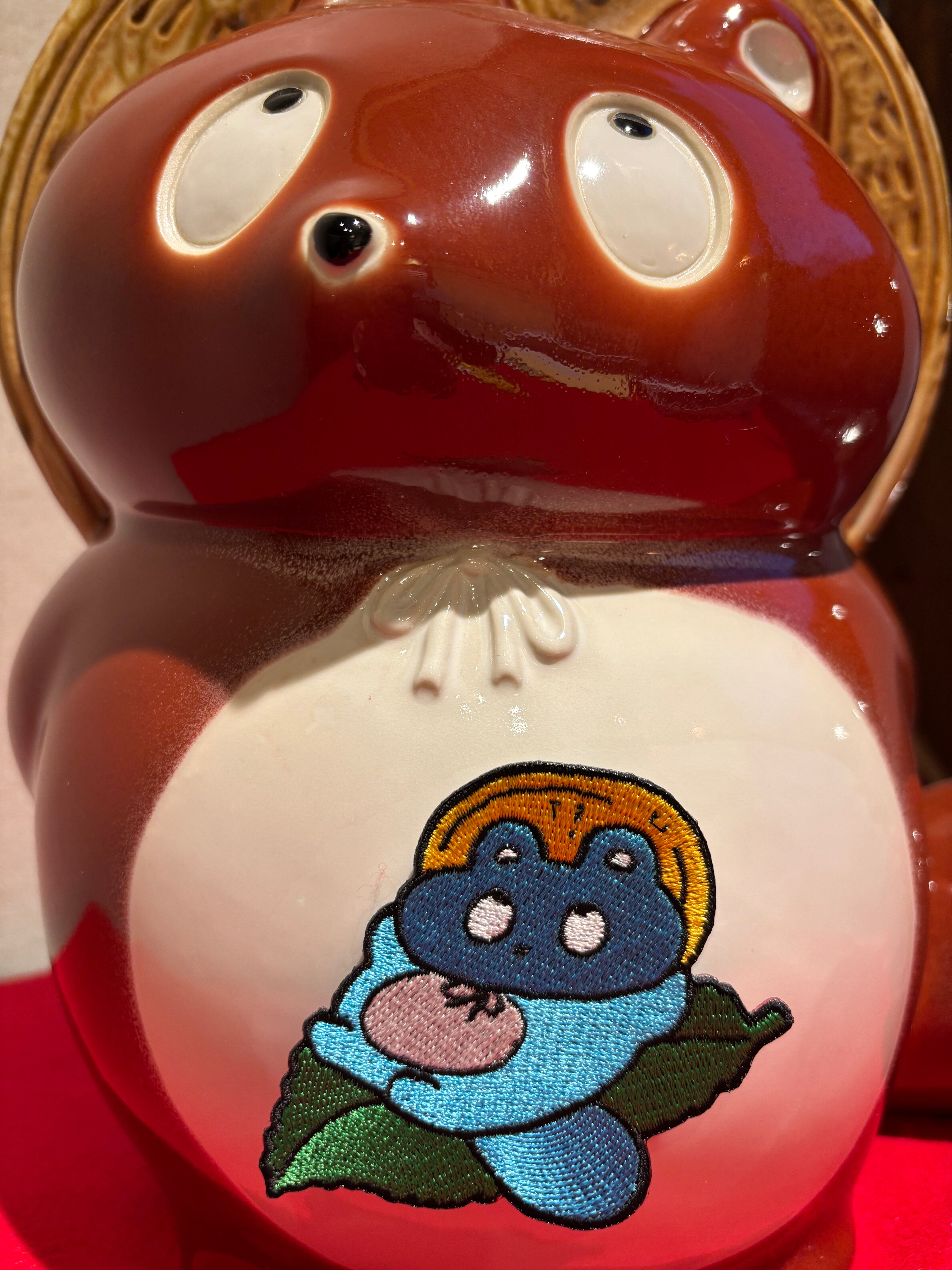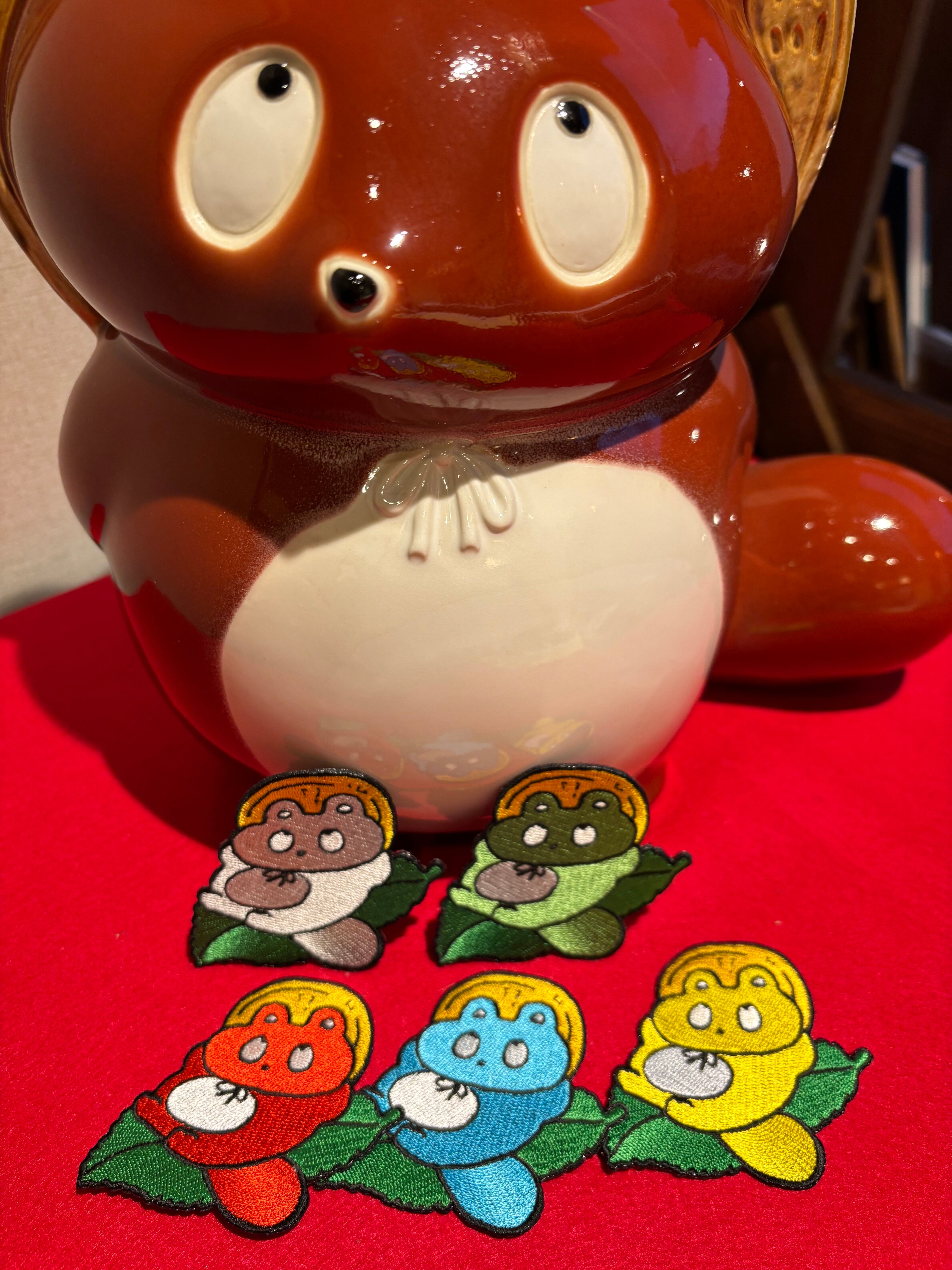ぼんやり子だぬきが葉っぱの上で寝転んでいる姿です。お好きな場所につけて楽しんでください。